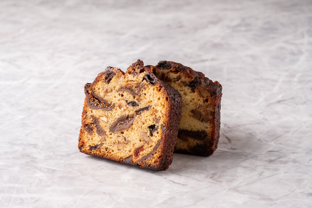 イチジク、オレンジ、レーズン、チェリー、アップルをラム酒で漬け込み、クルミ、ヘーゼルナッツと共にたっぷりと加えて焼きこんだフルーツのケーキ。